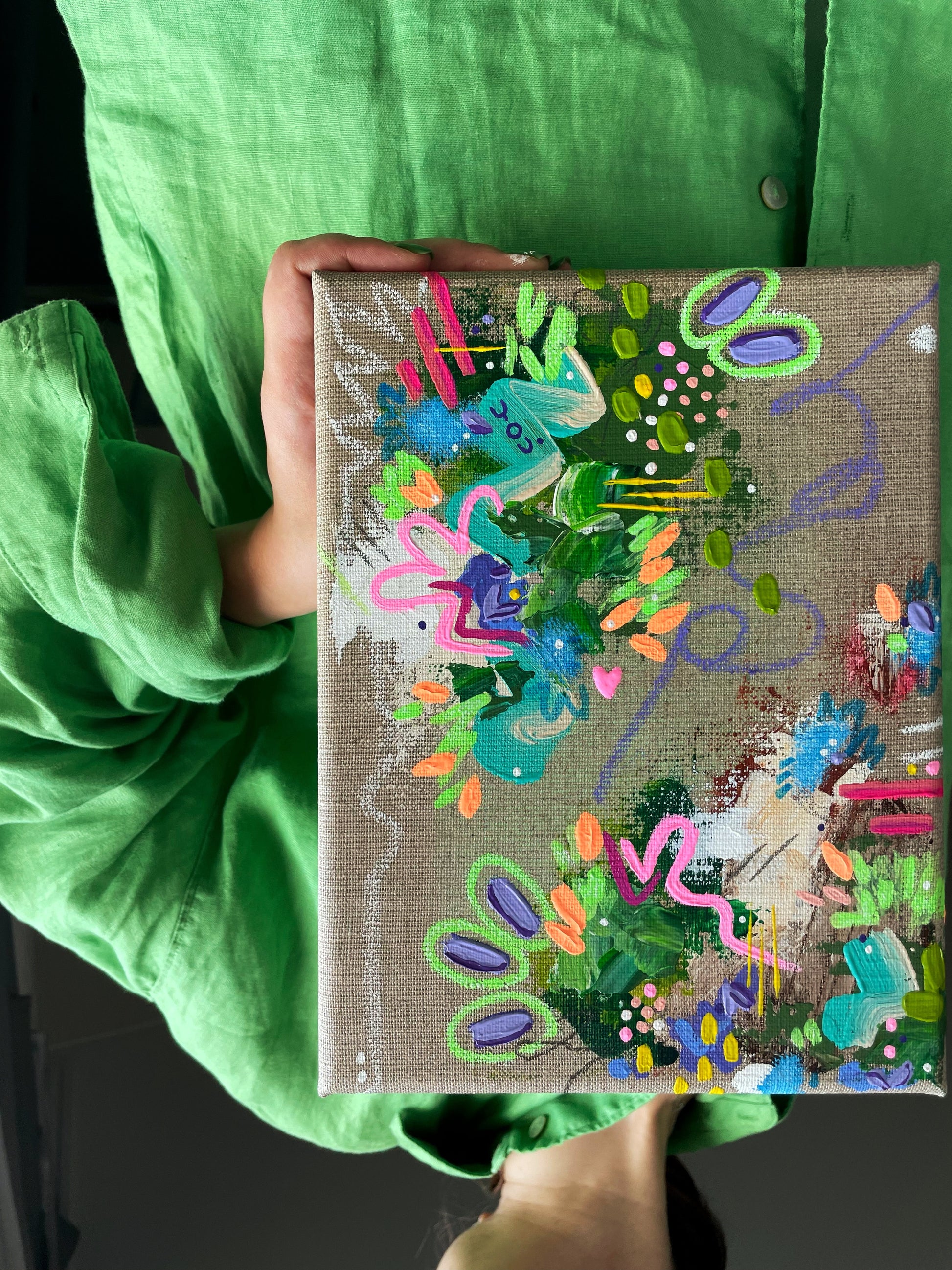 acrylic, wax pastels, linen canvas